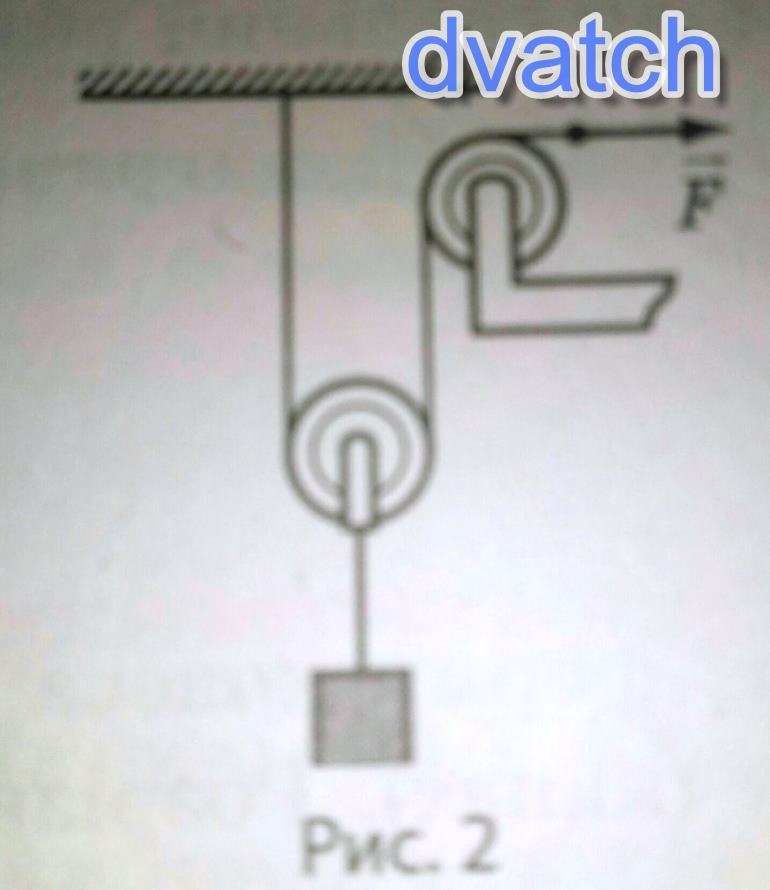Зображена на рисунку система рухомого та нерухомого блоків. Використання рухомого блока дає виграш у силі в два рази, а нерухомий лише змінює напрям дії сили.