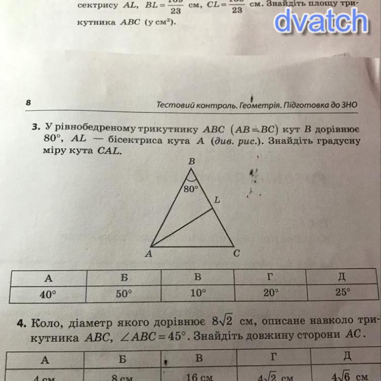У рівнобедренному трикутнику АВС кути при основі ВАС та ВСА рівні. Вони становлять по (180°-80°)/2 = 100°/2 = 50°. AL - бісектриса кута ВАС, тому вона ділить кут ВАС навпіл. Сам кут ВАС 50°, тоді кут CAL 50°/2 = 25°.