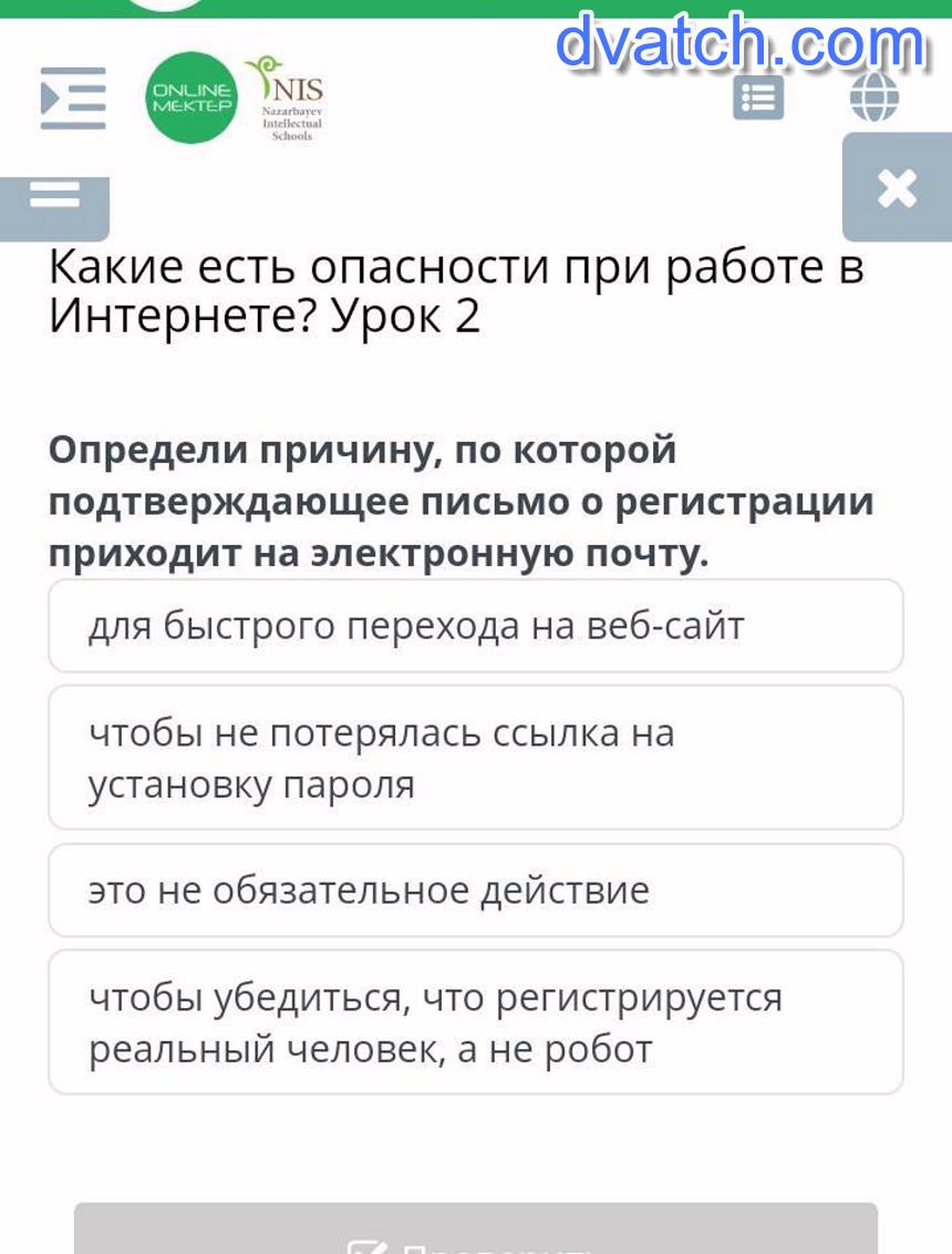 Какие есть опасности при работе в Интернете? Урок 2Определи причину, по которой подтверждающее письмо о регистрации приходит на электронную почту. для быстрого перехода на веб-сайтчтобы не потерялась ссылка на установку пароляэто не обязательное действиечтобы убедиться, что регистрируется реальный человек, а не роботНазадПроверить