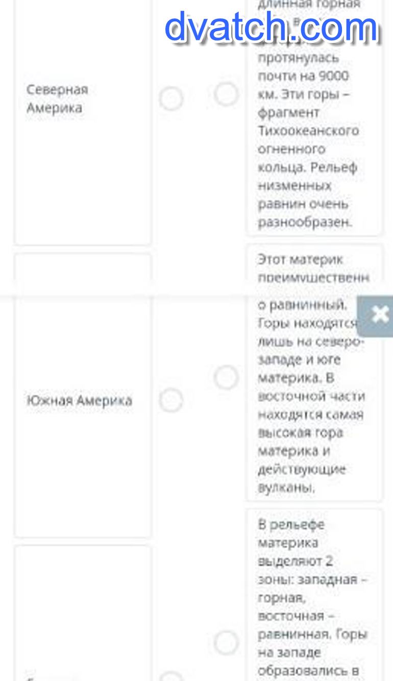 Материки и океаны Соотнеси названия материков с описанием. Количество соединений: 6 Северная Америка Южная Америка Евразия Африка Австралия Антарктида На материке находится самая длинная горная цепь в мире, которая протянулась почти на 9000 км. Эти горы – фрагмент Тихоокеанского огненного кольца. Рельеф низменных равнин очень разнообразен. Этот материк преимущественно равнинный. Горы находятся лишь на северо-западе и юге материка. В восточной части находятся самая высокая гора материка и действующие вулканы. В рельефе материка выделяют 2 зоны: западная – горная, восточная – равнинная. Горы на западе образовались в результате столкновения с Тихоокеанской литосферной плитой. Этот материк самый низкий из всех. В основном состоит из равнин, лишь на востоке и юго-востоке материка находятся невысокие горы. На территории материка нет складчатых гор, вулканов и оледенения. Средняя высота материка – 840 м. На этом материке находятся крупнейшие равнины и горные системы планеты. Самые высокие горы на Земле находятся здесь. Горы и нагорья занимают примерно 65 % территории. Материк покрыт толстым льдом толщиной в неКак узнать сколько километров. Из-за массы льда ложе материка прогнулось. Крупными формами рельефа также являются равнины, шельфовые ледники. Назад Проверить