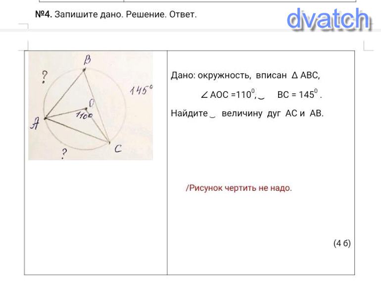 Центральный угол равен дуге, на которую он опирается, поэтому дуга АС равна 110°, дуга ВС равна 145°, остальное приходится на искомую дугу АВ, она равна 360°-145°-110°=105°