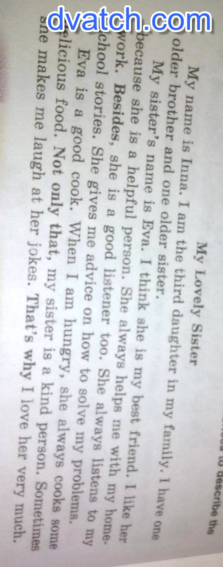 Надеюсь , я помогла♡︎ | Меня зовут Инна. Я третий ребенок в семье. У меня есть старшая сестра. Мою сестру зовут Ева. Я думаю, она моя лучшая подруга. Она мне нравится, потому что она отзывчивый человек. Она всегда помогает мне с домашним заданием. Кроме того, она еще и хороший слушатель. Она всегда слушает мои школьные рассказы. Она дает мне советы, как решить мои проблемы. Ева хорошо готовит. Когда я голодна, она всегда готовит вкусную еду. К тому же моя сестра - добрый человек. Иногда она заставляет меня смеяться над своими шутками. Поэтому я ее очень люблю. |
