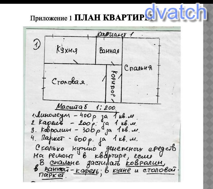 Что нужно сделать: 1. замерить нужные величины на плане квартиры. 2. с помощью масштаба квартиры перевести их в реальный размер. 3. найти площадь каждого помещения, как площадь прямоугольника. 4. вычислить стоимость ремонта каждой комнаты, умножив стоимость нужного покрытия на площадь комнаты. найти сумму ремонта в квартире, сложив стоимость ремонта всех комнат.