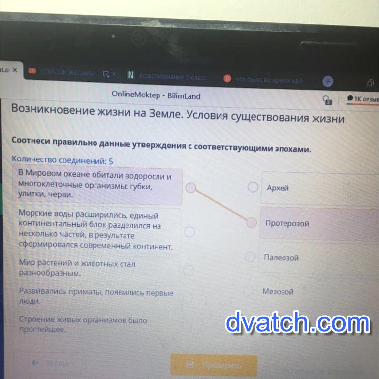 ЖИЗНИСоотнеси правильно данные утверждения с соответствующими эпохами. Количество соединений: 5В Мировом океане обитали водоросли имногоклеточные организмы: губки,улитки, черви. АрхейМорские воды расширились, единыйконтинентальный блок разделился нанеКак узнать сколько частей, в результатесформировался современный континент. ПротерозойПалеозойМир растений и животных сталразнообразным. Развивались примать, появились первыелюди. МезозойСтроение живых организмов былопростейшееКайнозой