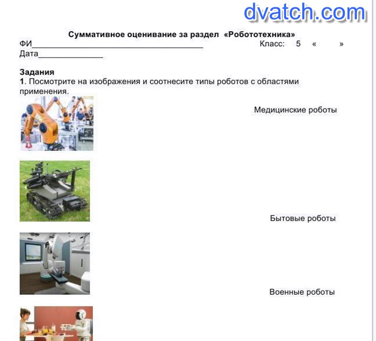 1. Посмотрите на изображения и соотнесение типы роботов с облостями применения