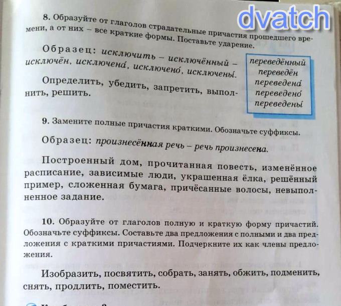 8. Определить - определённый - определён, определена, определено, убедить - убеждённый - убеждён, убеждена, убеждено, убеждены, запретить - запрещённый - запрещена, запрещено, запрещён, запрещены, выполнить - выполненный - выполнен, выполнена, выполнены, выполнено, решить - решённый - решён, решена, решено, решены.