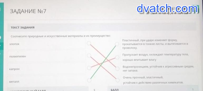 ЗАДАНИЕ No7ОБЩЕЕ ВРЕМЯ: 06:23 xВРЕМЯ НА ЗАДАНИЕ: 03:24ТЕКСТ ЗАДАНИЯсоотнесите природные и искусственные материалы и их преимущество:honomПластичный при ударе изменяет форму,прокатывается в тонкие листы, и вытягивается вПроволокуПолиэтиленПропускает воздух, охлаждает температуру тела,хорошо впитывает влагуkanpon ,Водонепроницаем, устойчив к агрессивным средам. Очень прочный, эластичный,устойчива к действие различных химикатов. СКАЖИТЕ ПРАВИЛЬНОЕ