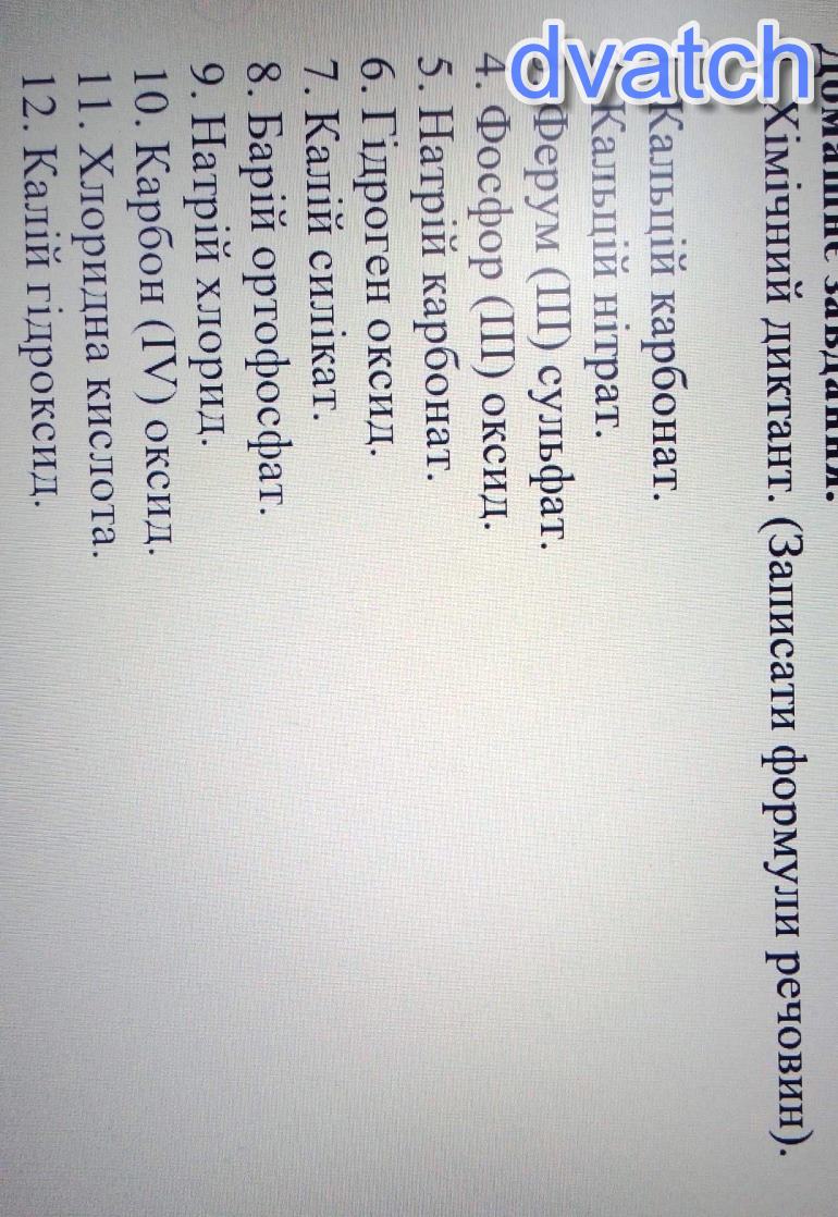 1. Хімічний диктант. (Записати формули речовин). 1. Кальцій карбонат. 2. Кальцій нітрат. 3. Ферум (ІІ) сульфат. 4. Фосфор (ІІ) оксид. 5. Натрій карбонат. 6. Гідроген оксид. 7. Калій силікат. 8. Барій ортофосфат. 9. Натрій хлорид. 10. Карбон (IV) оксид. 11. Хлоридна кислота. 12. Калій гідроксид. (ПОМОГІТЕ )