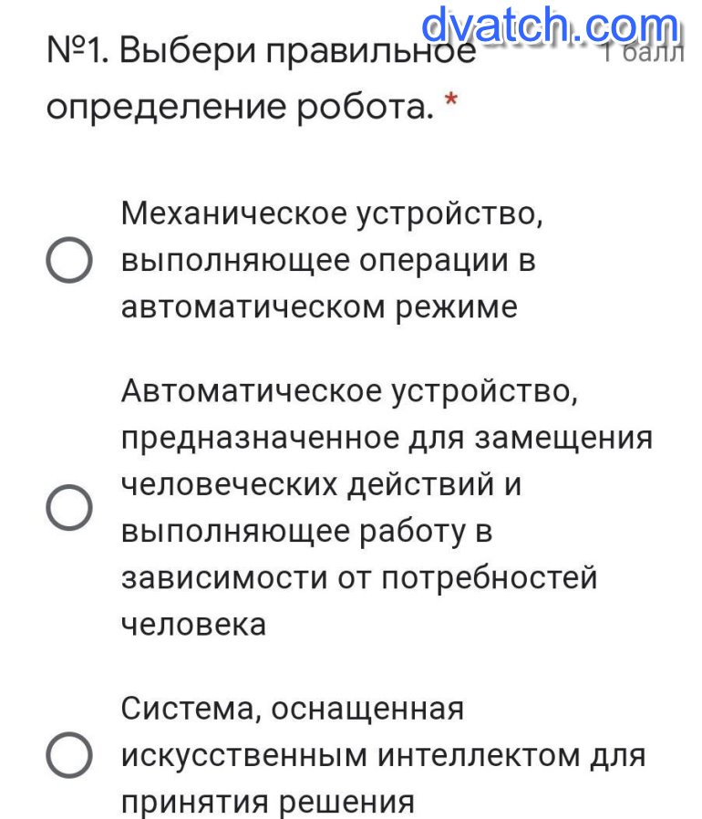 №1. Выбери правильное определение робота. *1 баллМеханическое устройство, выполняющее операции в автоматическом режимеАвтоматическое устройство, предназначенное для замещения человеческих действий и выполняющее работу в зависимости от потребностей человекаСистема, оснащенная искусственным интеллектом для принятия решения ПАЖАЛУЙСТА У МЕНЯ СОР