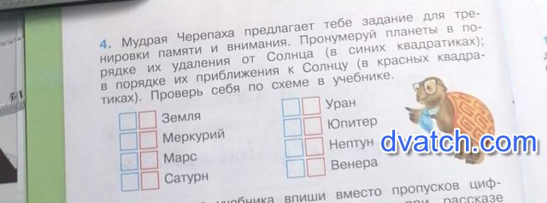 4. Мудрая Черепаха предлагает тебе задание для тре- нировки памяти и внимания. Пронумеруй планеты в по- рядке их удаления от Солнца (в синих квадратиках); в порядке их приближения к Солнцу (в красных квадра- тиках). Проверь себя по схеме в учебнике. о Земля Меркурий Марс Сатурн Уран Юпитер Нептун Венера -