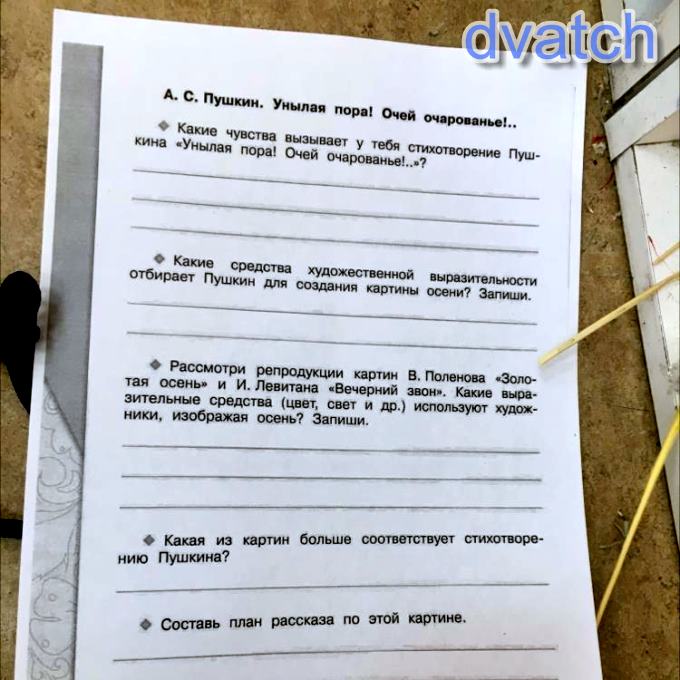 ы на вопросы:n1. Это стихотворение вызывает у меня очень приятные чувства, воздушные и прекрасные. Представляется осень очень красивой и красочной. n2. Пушкин использовал в стихотворении эпитеты: «могильная пропасть», «свежее дыханье». Также использует инверсию: «Люблю я пышное природы увяданье». n3. Для этого стихотворения более подходит картина В. Поленова "Золотая осень". Он использует яркие цвета, краски: желтый, зеленый, оранжевый, голубой, коричневый, серый. Также использует яркий свет.