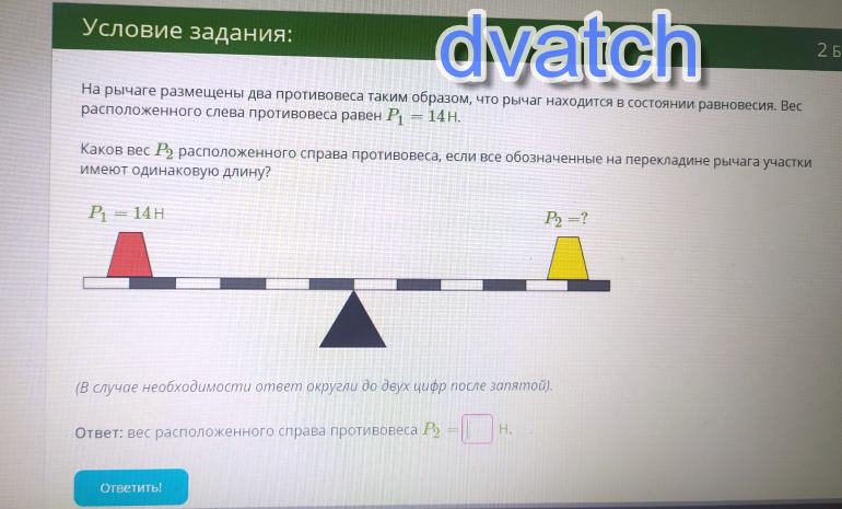 На рычаге размещены два противовеса таким образом, что рычаг находится в состоянии равновесия. Вес расположенного слева противовеса равен P1=14HКаков все P2 расположенного справа противовеса, если все обозначенные на перекладине рычага участки имеют одинаковую длину?