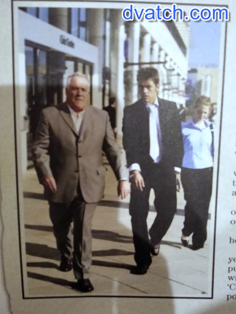 There seem to be two men, one young and the other elderly and a young woman along with them. They all are dressed in formal business attire. The people walking down the street clearly weren't prepared to be taken a picture of, judging by their demeanor. A presumption can also be made that it is about 4 pm judging by the shadows the individuals possess, but it is difficult to tell for sure because other factors have to be taken into account as well.