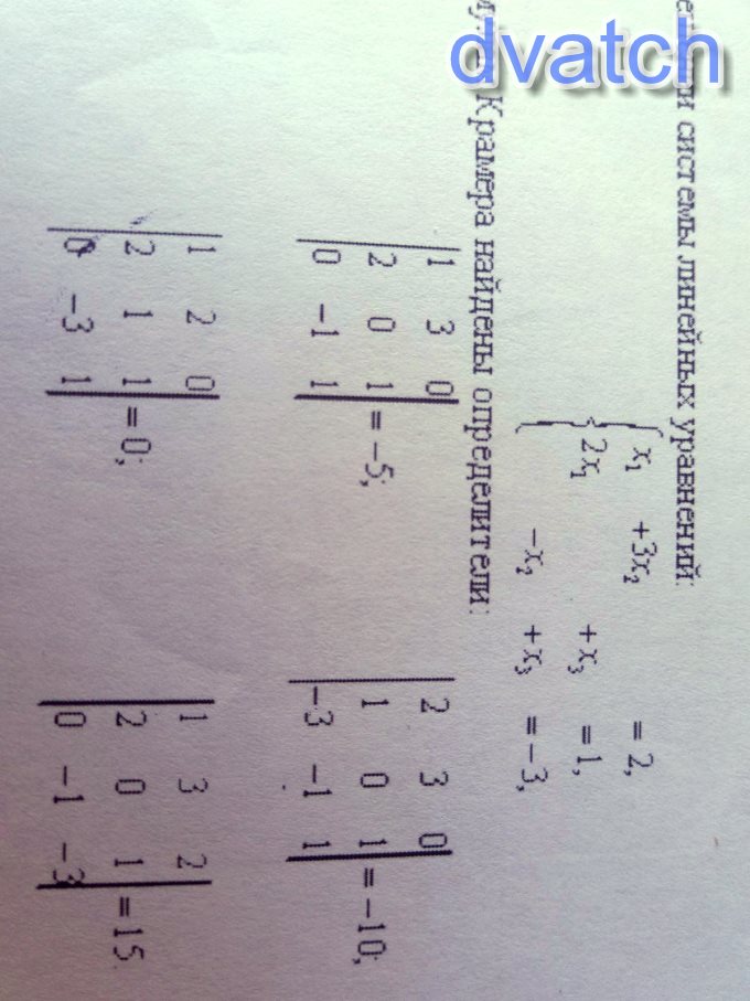 х ₁ =Δ₁/Δ = - 10/(- 5 ) = 2 ; х ₂ =Δ₂/Δ = 0/(- 5 ) = 0 ; х ₃ =Δ₃/Δ = 15/(- 5 ) = - 3 .
