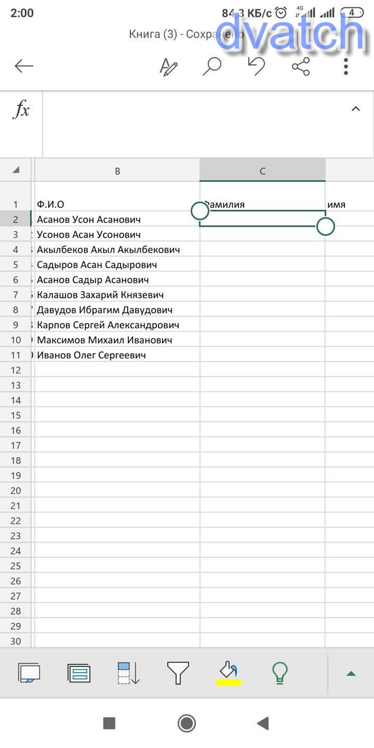 Используя текстовые функции пстр(…), найти(…), длстр(…), левсимв(…), правсимв(…), & (сцепить текстовые строки), заполнить вставленные столбцы. В столбце, содержащем фамилию и инициалы, инициалы должны отделяться друг от друга точкой и пробелом, а от фамилии – пробелом