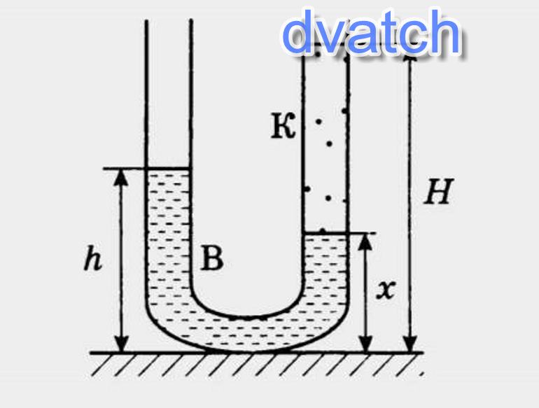 В u- образную трубку с вертикальными коленами налиты керосин и вода(см рисунок). На рисунке х = 10 см H = 30см. Определите высоту h столба в левом колене