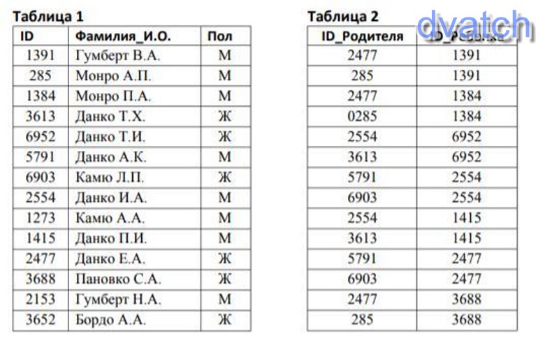 В таблице 2 ID_Ребёнка с номером 1384 со ствуют ID 2477 и ID 0285 из ID_Родителя (отец и мать Монро П. А. ).