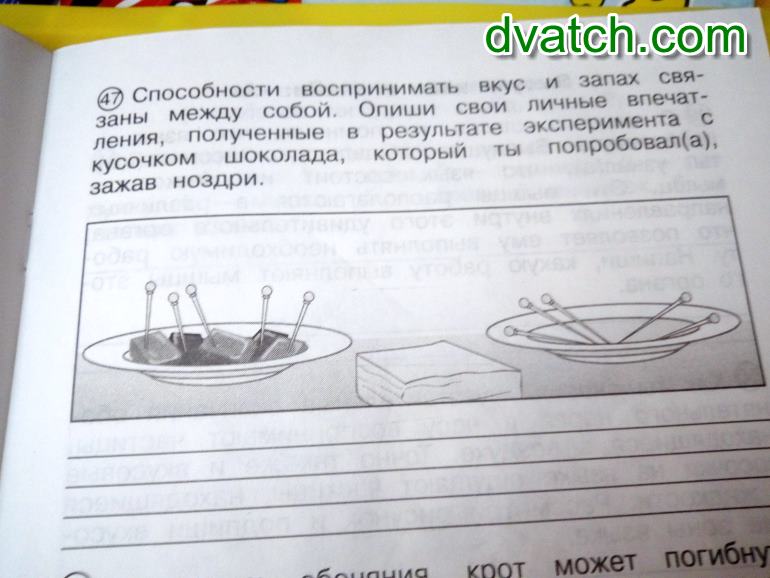 Способности воспринимать вкус и запах связаны между собой. Опиши свои личные впечатления, полученные в результате эксперимента с кусочком шоколада, который ты попробовал(а), зажав ноздри. ______________________________________________________________