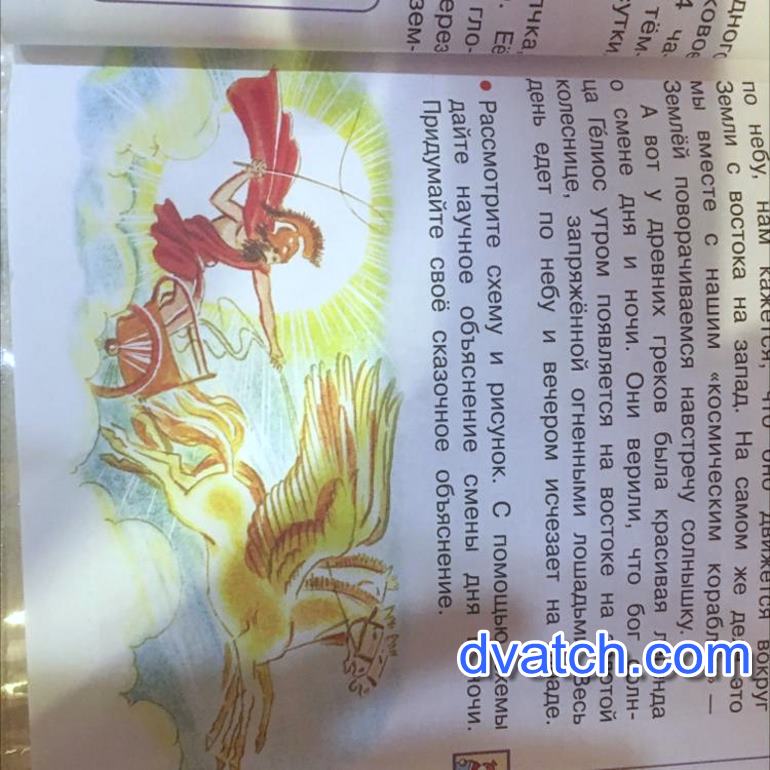 Бог Гелиос управляет золотыми конями с крыльями. Они достали до небес, потому что кони умеют летать. Кони долетели до солнца и поэтому они переливаются. Гелиос стоя в своей колеснице бьёт коней, чтобы те летели быстрее.
