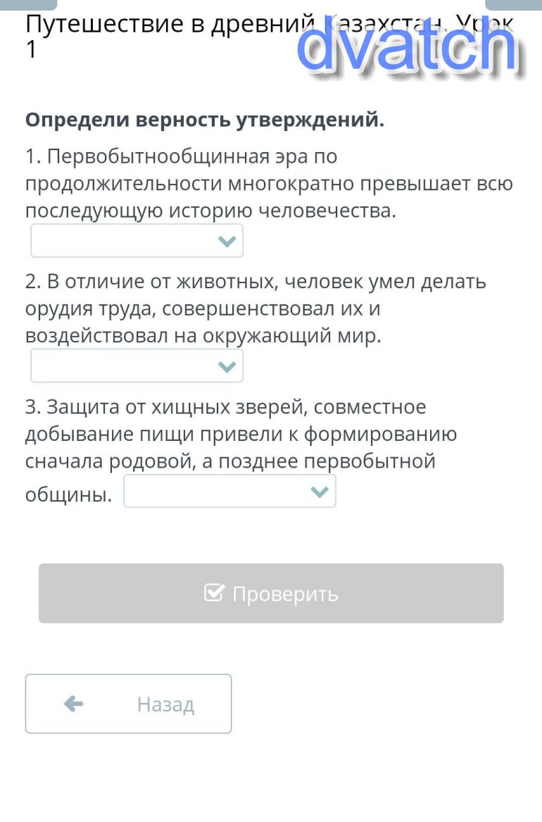 Путешествие в древний Казахстан. Урок 1Определи верность утверждений. Первобытнообщинная эра по продолжительности многократно превышает всю последующую историю человечества. 2. В отличие от животных, человек умел делать орудия труда, совершенствовал их и воздействовал на окружающий мир. 3. Защита от хищных зверей, совместное добывание пищи привели к формированию сначала родовой, а позднее первобытной общины. посчитайте
