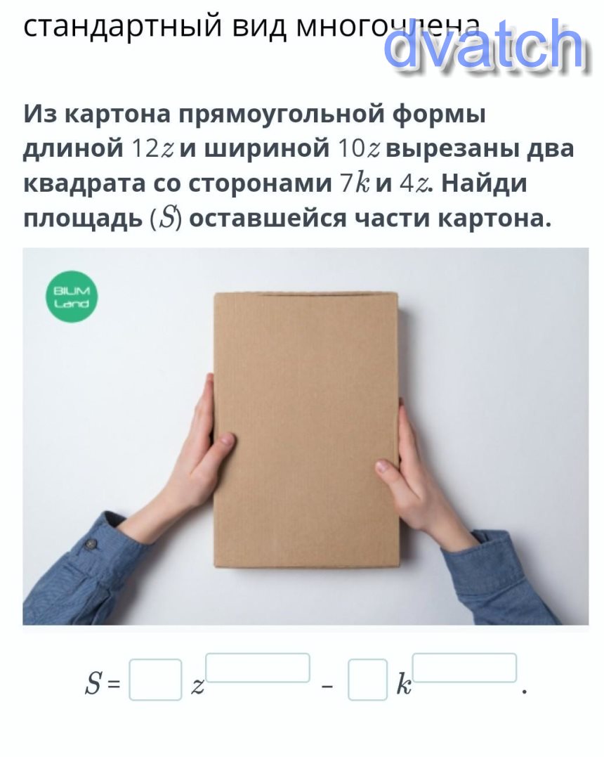 Возьмем полностью картонку, ее стороны 12 и 10, перемножим и получим 120, т. е площадь картона - 120z², т. мы не забыли про z, далее берем 7k и возводим в квадрат, т. е (7k)²=28k², повторяем с 2 квадратом (4z)²=16z², далее мы из 120z² вычитаем 16z² 120-16=104 - оставшаяся площадь картона, а далее для простоты расчета отбрасываем буквы, и из 104 вычитаем 28, 104-28= 76