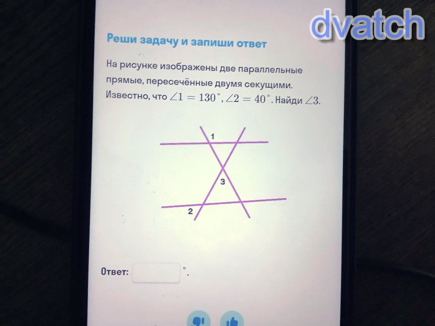 на рисунке изображены две параллельные прямые пересечённые двумя секущими Исвестно что угол 1=130 градусов ,2=40 градусов . Найдите угол 3