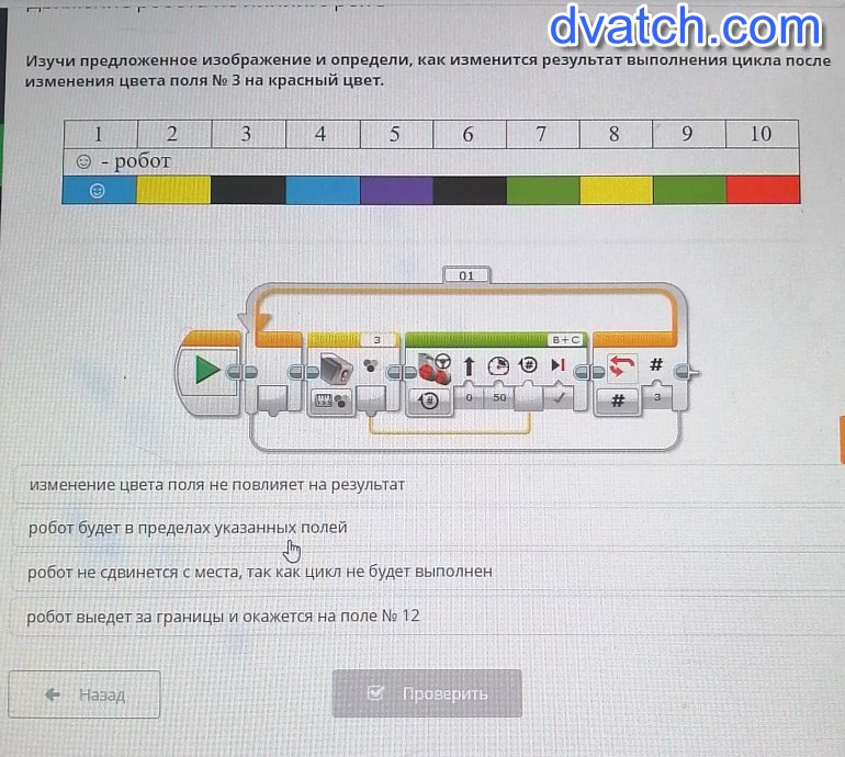 Изучи предложенное изображение и определи, как изменится результат выполнения цикла послеизменения цвета поля No 3 на красный цвет. 3456. 7891012O - робототниBCТВ 40>- #LPизменение цвета поля не повлияет на результатДоробот будет в пределах указанных полейробот не сдвинется с места, так как цикл не будет выполненробот выедет за границы и окажется на поле No 12ТЕ. - Назадо проверитьАктивация Windowsстората свете прос нере