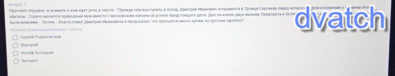 Вопрос 1Прочтите отрывок и укажите о ком идет речь в тексте - "Премсде чем выступить в поход, Дмитрий Иванович отправился в Троице-Сергиеву лавру испросить благословения у игумена этойобители. . . Горячо молился праведный муж вместе с московским князем об успехе предстоящего дела. Дал он князю двух иноков, Перисвета и Ослябя, которые до поступления в монастырьбыли воинами. Потом. . благословил Дмитрия Ивановича и предсказал, что прольется много крови, но русские одолеют". Укажите правильный вариант ответаСергий РадонежскийМакарийИосиф ВолоцкийФиларет