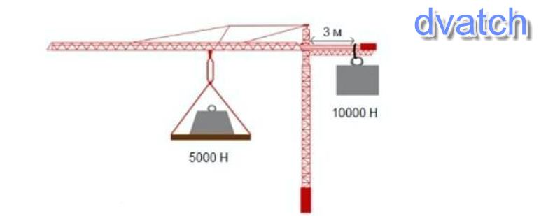 На рисунке изображен кран с противовесом. а) На каком расстоянии от оси вращения должна расположиться нагрузка в 5000 Н, чтобы кран оставался в равновесии? [2]b) Если нагрузка увеличится до 20000 Н, на какое расстояние необходимо переместить груз от оси вращения? [1]с) Вычислите момент силы.