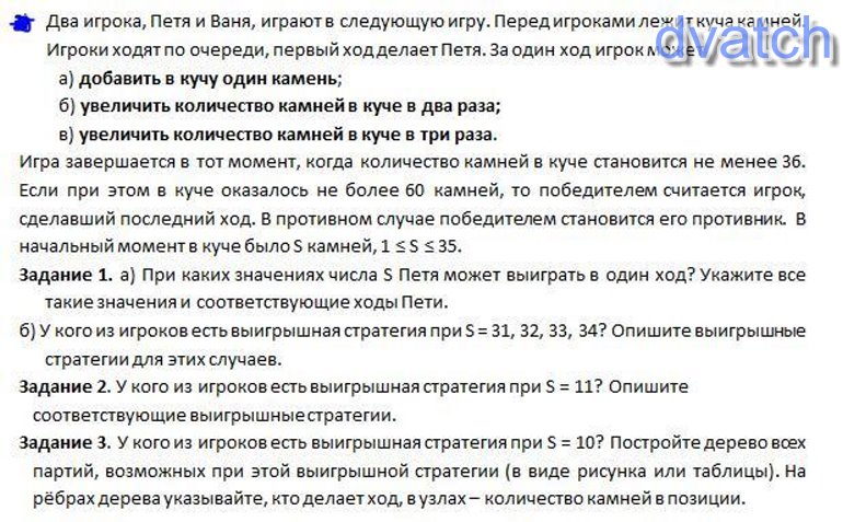 посчитайте, с заданием по информатике Два игрока, Петя и Ваня, играют в следующую игру. Перед игроками лежит куча камней. Игроки ходят по очереди, первый ход делает Петя.