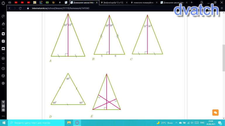 В. По определению дан равнобедренный треугольник. Розовый отрезок является биссектрисой (делит угол на равные) и высотой (отмечен прямой угол), значит он является и медианой и должен делить основание на равные отрезки, но это не так. Данные неверные.