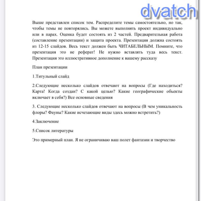 нужно сделать презентацию, где у тебя будет титульный слайд, на следующих слайдах у тебя будет карта(где находится), когда создан(допустим заповедник), с какой целью он создан и что в себя включает. Каких животных, растений, какие исчезающие виды можно там встретить. Дальше заключение(тобишь вывод) и список литературы(откуда ты брал(а) это всё)