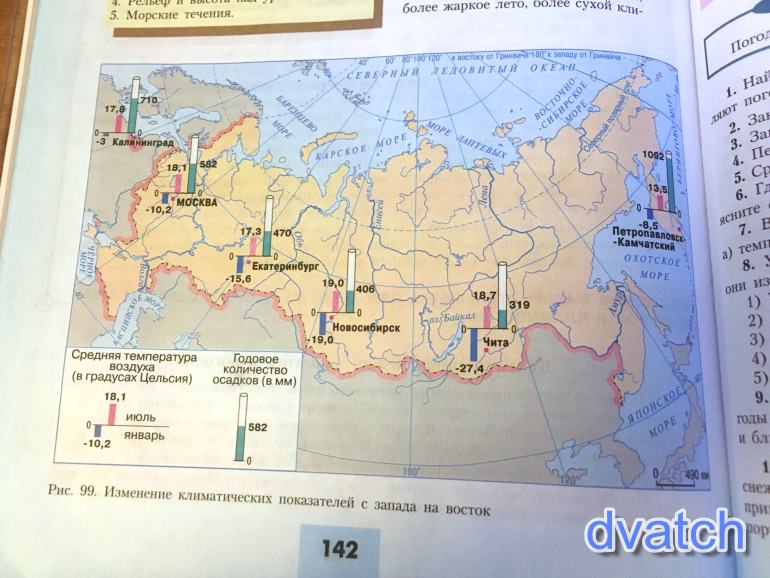 Чем дальше от океана , тем суше (осадков меньше) , теплее летом , холоднее зимой ,