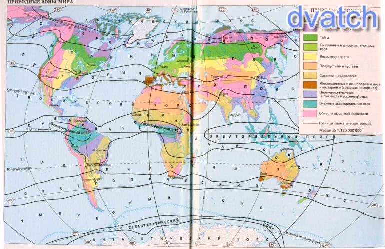 Арктические пустыни, тундра и лесотундра, тайга, смешанные и широколиственные леса, лесостепи и степи, полупустыни и пустыни, саванны и редколесья, средиземноморская природная зона, переменно-влажные леса.