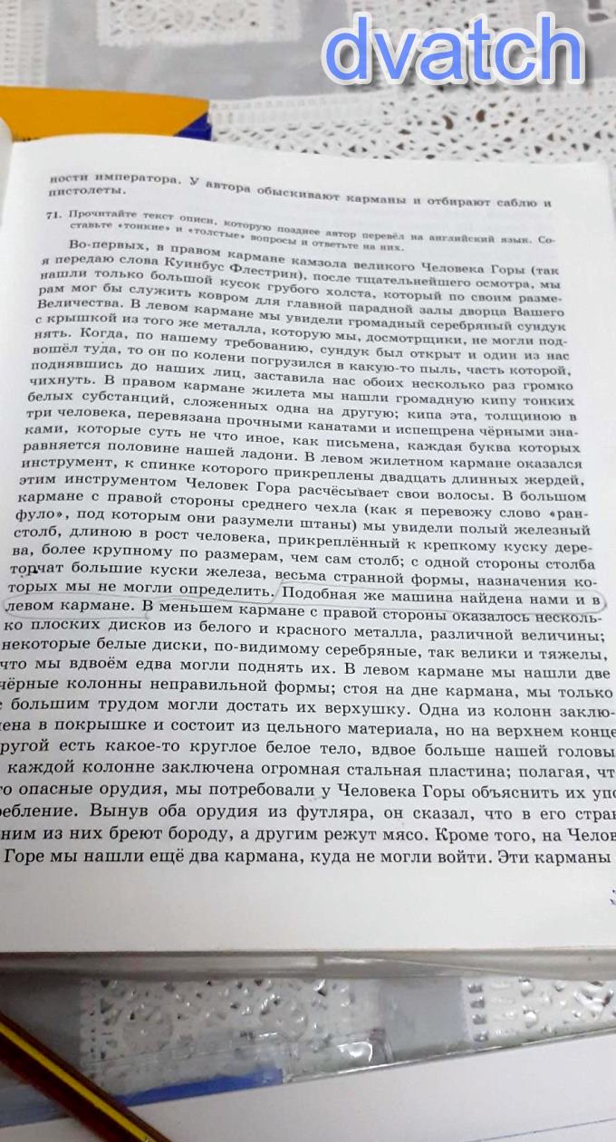 й 71. Прочитайте текст описи, которую позднее автор перевёл на английский язык. Со- ставьте «тонкие» и «толстые» вопросы и ответьте на них. Во-первых, в правом кармане камзола великого человека Горы (так я передаю слова Куинбус Флестрин), после тщательнейшего осмотра, мы нашли только большой кусок грубого холста, который по своим разме- рам мог бы служить ковром для главной парадной залы дворца Вашего Величества. В левом кармане мы увидели громадный серебряный сундук с крышкой из того же металла, которую мы, досмотрщики, не могли под- нять. Когда, по нашему требованию, сундук был открыт и один из нас вошёл туда, то он по колени погрузился в какую-то пыль, часть которой, поднявшись до наших лиц, заставила нас обоих неКак узнать сколько раз громко чихнуть. В правом кармане жилета мы нашли громадную кипу тонких белых субстанций, сложенных одна на другую; кипа эта, толщиною в три человека, перевязана прочными канатами и испещрена чёрными зна- ками, которые суть не что иное, как письмена, каждая буква которых равняется половине нашей ладони. В левом жилетном кармане оказался инструмент, к спинке которого прикреплены двадцать длинных жердей этим инструментом Человек Гора расчёсывает свои волосы.